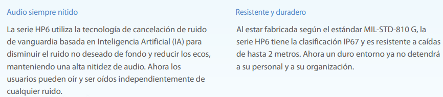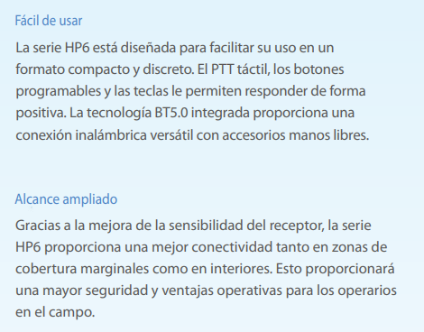 El HP606 está diseñada para uso fácil en una forma compacta y discreta, el PTT táctil, los botones y las teclas programables permiten que los profesionales respondan de manera inmediata.
