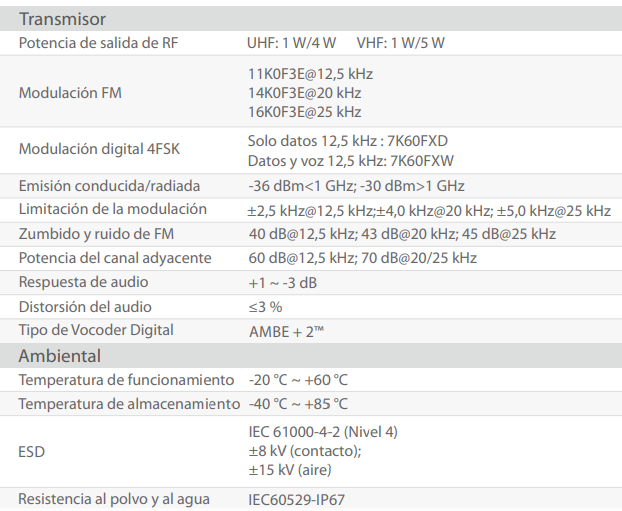 | Temperatura de Funcionamiento | -30℃~+60℃ (solo el radio) |