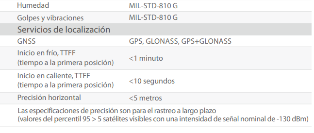 | Duración de la batería (Ciclo de Trabajo 5/5/90, Alta Potencia de TX) | 16h (GNSS ON); 20h (GNSS OFF ) |