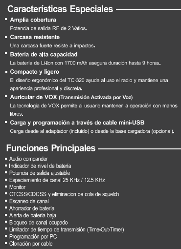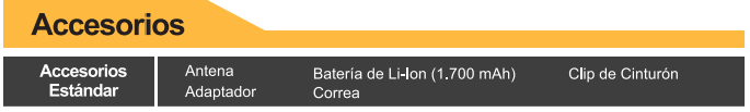 Incluye: Batería Ion Litio de 1700 mAh, cargador Mini USB, antena, clip y cinta de transporte.