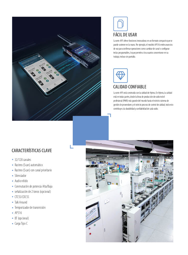 El radio bidireccional Hytera AP516, completamente analógico, brinda un audio intenso y nítido con el altavoz de 3 W. La gran capacidad de la batería permite que el radio trabaje 17 horas continuas, la carga USB tipo C facilita la carga del radio con una fuente de alimentación móvil para reponer energía al instante. Con rango de cobertura extendido y una serie de funciones que aumentan la productividad y la eficiencia, el AP516 asegura que se mantenga conectado y productivo esté donde esté.