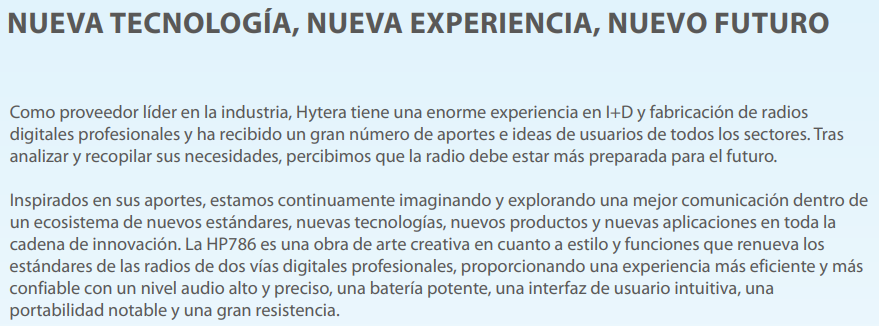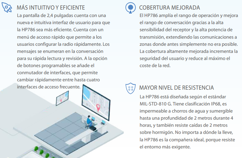 El radio HP786 es un nuevo radio digital profesional y representa el futuro en estilo y funciones que han actualizado los estándares de los radios digitales, brindando una comunicación más eficiente y confiable con audio alto y claro, batería potente, portabilidad y robustez notable, es fácil de usar en múltiples entornos e industrias.