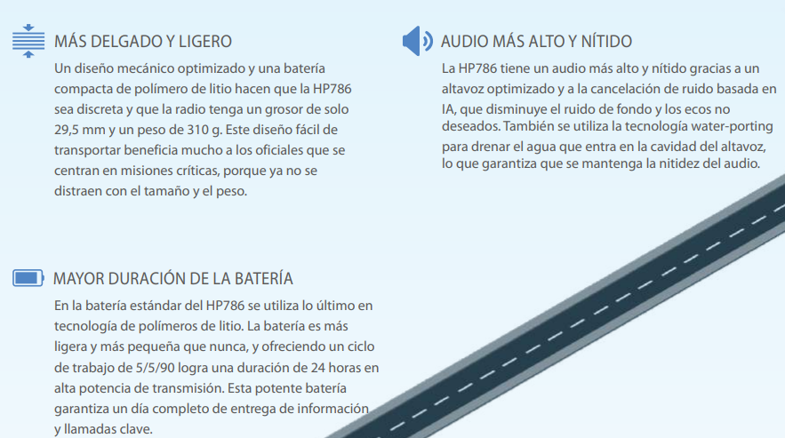Un diseño mecánico mejorado y una batería compacta de polímero de litio se han diseñado discretamente para encajar en el diseño del HP786, lo que hace que el radio tenga 29,5 mm de grosor y 310 g de peso, fácil de transportar.