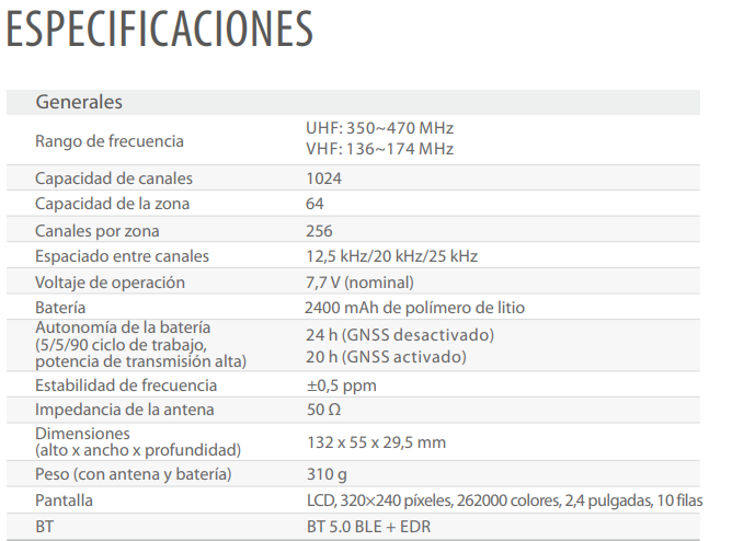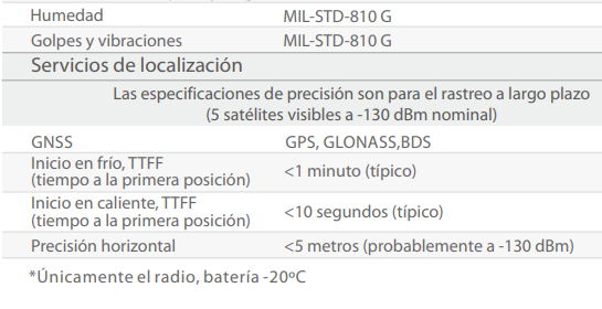 | Duración de La Batería (Ciclo de Trabajo 5/5/90, Alta Potencia de TX) | 24h (GNSS apagado)/20h (GNSS encendido) |