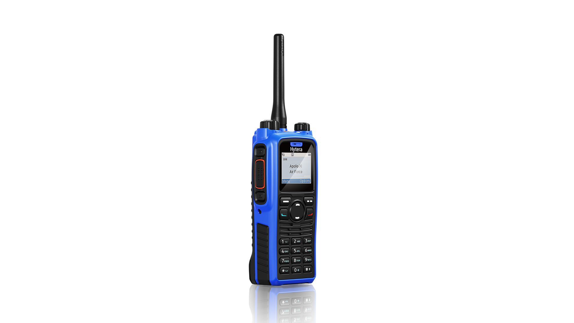 Hytera aplica el diseño para descargas electrostáticas y la tecnología de moldeado con materiales dobles en la radio. El material para descargas electrostáticas (azul) minimiza la acumulación electrostática en la superficie de la radio y el material sólido (negro) maximiza la resistencia del cerrami.