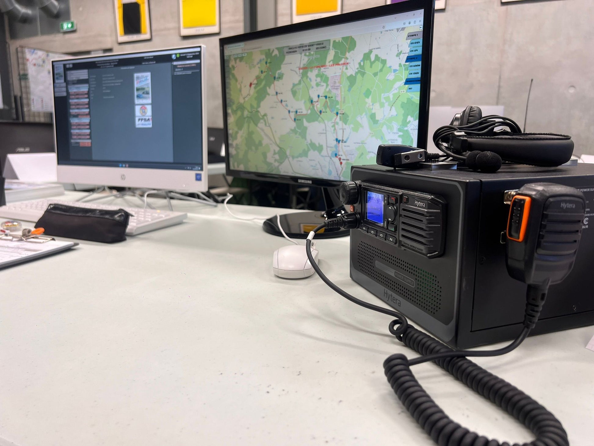 El gabinete de la estación base de escritorio suministra energía a la radio móvil a través de la red eléctrica o una batería de respaldo.