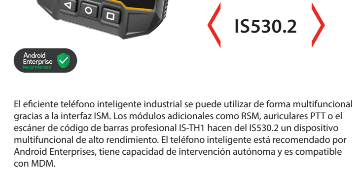 El smartphone intrínsecamente seguro de alto rendimiento puede utilizarse de diversas formas gracias a la interfaz ISM. Módulos adicionales como el micrófono con altavoz remoto, los auriculares PTT o el escáner profesional de códigos de barras IS-TH1xx.2 convierten al IS530.2 en un dispositivo multifuncional de alto rendimiento. El smartphone cuenta con Android Enterprise Recommended, capacidad zero-touch y es compatible con MDM.