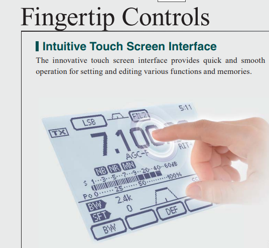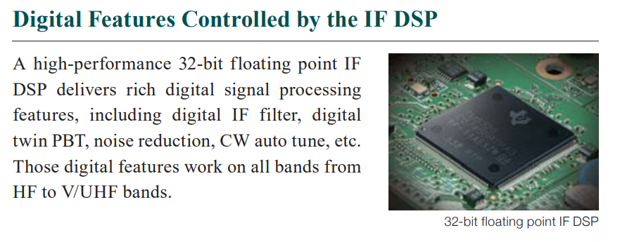 Un DSP de FI de 32 bits y coma flotante de alto rendimiento ofrece numerosas funciones de procesamiento digital de señales, como filtro de FI digital, PBT doble digital, reducción de ruido, sintonización automática de CW, etc. Estas funciones digitales funcionan en todas las bandas, desde HF hasta V/UHF.