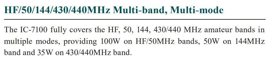 El IC-7100 cubre totalmente las bandas de aficionados de HF, 50, 144, 430/440 MHz en múltiples modos, proporcionando 100W en las bandas de HF/50MHz, 50W en la banda de 144MHz y 35W en la banda de 430/440MHz.
