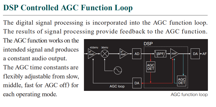 El procesamiento digital de la señal se incorpora al bucle de la función AGC. Los resultados del procesamiento de la señal proporcionan retroalimentación a la función AGC. La función AGC trabaja sobre la señal prevista y produce una salida de audio constante. Las constantes de tiempo del AGC se pueden ajustar de forma flexible entre lento, medio y rápido (o AGC desactivado) para cada modo de funcionamiento.