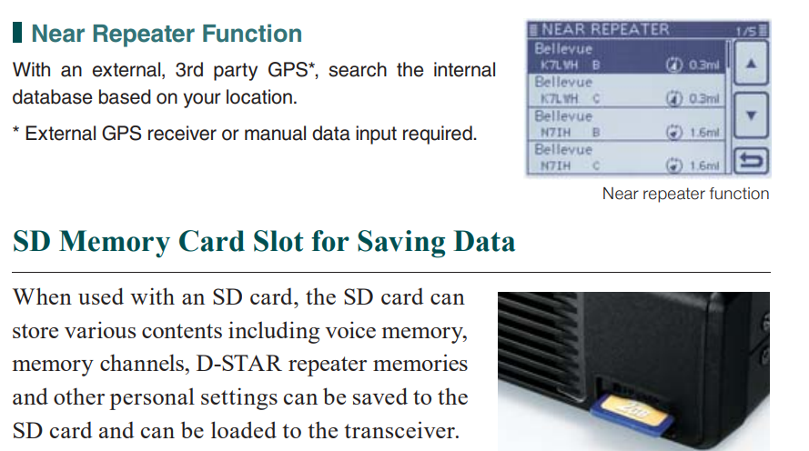 Cuando se utiliza con una tarjeta SD, la tarjeta SD puede almacenar diversos contenidos, incluyendo la memoria de voz, canales de memoria, memorias de repetidor D-STAR y otros ajustes personales se pueden guardar en la tarjeta SD y se pueden cargar en el transceptor.