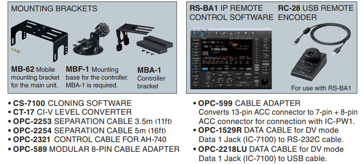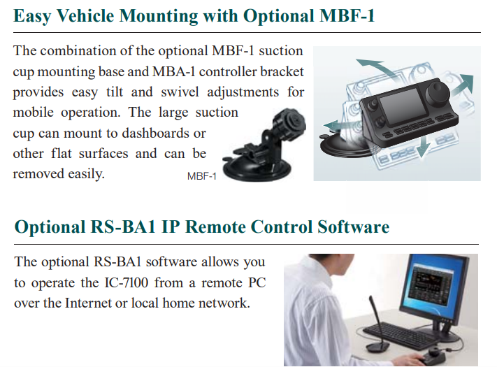 Icom cambió la forma de pensar de Radioafición sobre la comunicación móvil de HF en 1995 con la introducción del IC-706. Desde entonces, las radios HF móviles de Icom han sido la radio móvil HF de rendimiento de elección. En la Tokyo Hamfair de 2012, Icom volvió a cambiar las comunicaciones HF móviles con la introducción del IC-7100. La facilidad de operación con el control de la punta del dedo utilizando la interfaz de pantalla táctil intuitiva con el poder de 32 bits IF DSP.