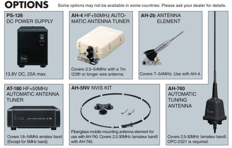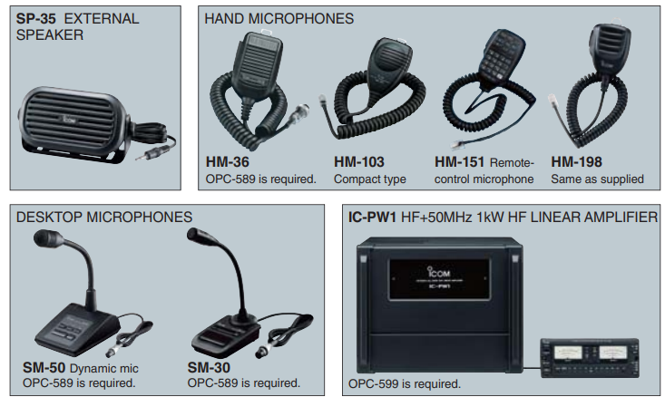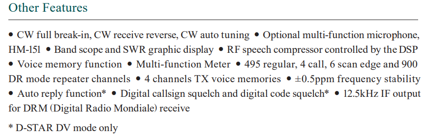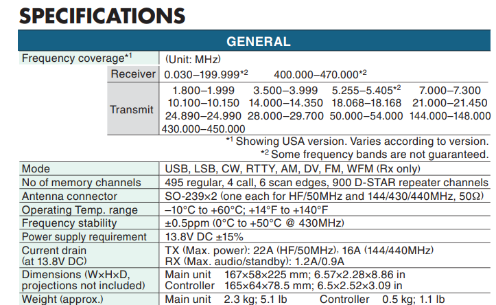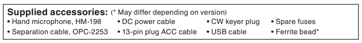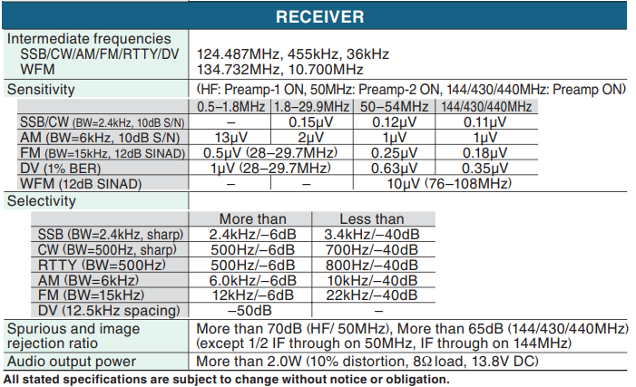 | Frecuencias intermedias | SSB/CW/AM/FM/RTTY/DV: | 124,487 MHz, 455 kHz, 36 kHz |