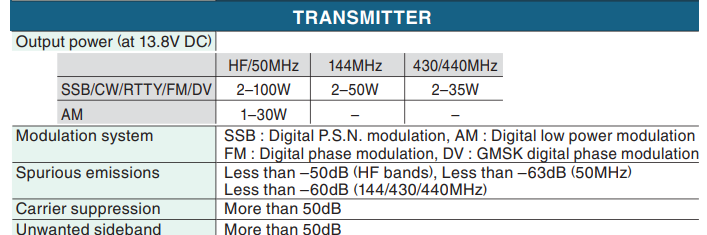 | Transmitir | 1,800-1,999MHz 3,500-3,999MHz 5,255-5,405MHz*2 7.000-7.300MHz 10.100-10.150MHz 14.000-14.350MHz 18,068-18,168MHz 21.000-21.450MHz 24.890-24.990MHz 28.000-29.700MHz 50.000-54.000MHz 144.000-148.000MHz 430.000-450.000MHz |