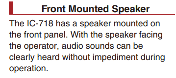 El IC-718 tiene un altavoz montado en el panel frontal. Con el altavoz orientado hacia el operador, los sonidos de audio se pueden escuchar con claridad y sin impedimentos durante el funcionamiento.