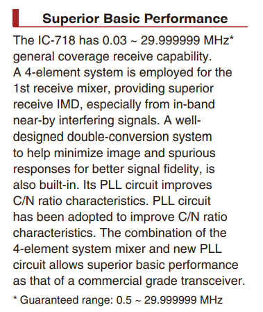 El IC-718 tiene una capacidad de recepción de cobertura general de 0,03 ~ 29,999999 MHz*. Se emplea un sistema de 4 elementos para el primer mezclador de recepción, lo que proporciona una recepción IMD superior, especialmente de señales de interferencia cercanas dentro de la banda. También se incorpora un sistema de doble conversión bien diseñado para ayudar a minimizar las respuestas de imagen y espurias para una mejor fidelidad de la señal. Su circuito PLL mejora las características de la relación C/N. Se ha adoptado el circuito PLL para mejorar las características de la relación C/N. La combinación del mezclador del sistema de 4 elementos y el nuevo circuito PLL permite un rendimiento básico superior al de un transceptor de calidad comercial.