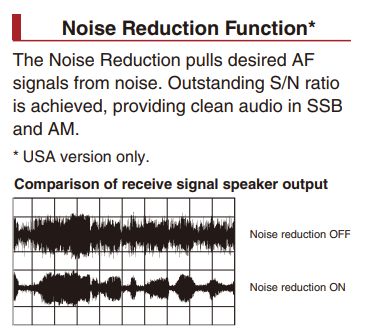 La reducción de ruido separa las señales AF deseadas del ruido. Se logra una excelente relación señal/ruido, lo que proporciona un audio nítido en SSB y AM.