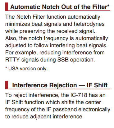 Para rechazar la interferencia, el IC-718 tiene una función IF Shift que cambia electrónicamente la frecuencia central de la banda de paso IF para reducir la interferencia adyacente.