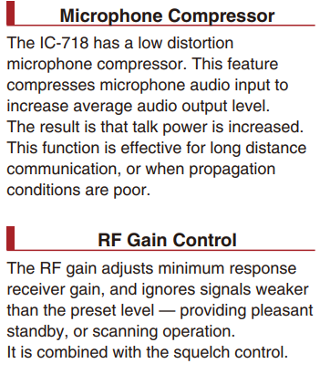 El IC-718 tiene un compresor de micrófono de baja distorsión. Esta función comprime la entrada de audio del micrófono para aumentar el nivel de salida de audio promedio. El resultado es que aumenta la potencia de conversación. Esta función es eficaz para comunicaciones de larga distancia o cuando las condiciones de propagación son deficientes.