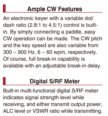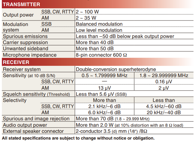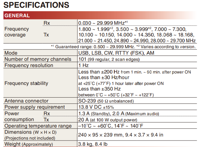| Tx | 1.800 ~ 1.999 *2 , 3.500 ~ 3.999 *2 , 7.000 ~ 7.300, 10.100 ~ 10.150, 14.000 ~ 14.350, 18.068 ~ 18.168, 21.000 ~ 21.450, 24.890 ~ 24.990, 28.000 ~ 29.700 MHz |