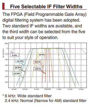 Se ha adoptado el sistema de filtrado digital FPGA (Field Programmable Gate Array). Hay dos anchos de FI estándar disponibles y se puede seleccionar un tercer ancho entre cinco para adaptarse a su estilo de operación sin necesidad de comprar un filtro.