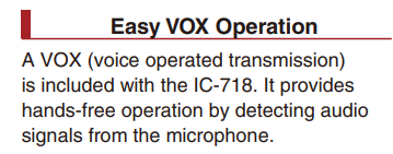 El IC-718 incluye un sistema de transmisión por voz (VOX), que permite el funcionamiento con manos libres al detectar señales de audio del micrófono.