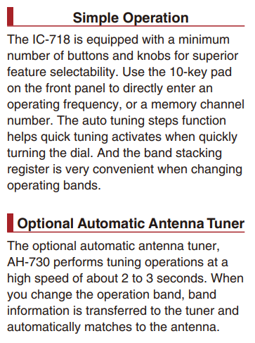 El IC-718 está equipado con un número mínimo de botones y perillas para una selección superior de funciones. Utilice el teclado de 10 teclas del panel frontal para ingresar directamente una frecuencia operativa o un número de canal de memoria. La función de pasos de sintonización automática ayuda a que la sintonización rápida se active al girar rápidamente el dial. Y el registro de apilamiento de bandas es muy conveniente al cambiar las bandas operativas.