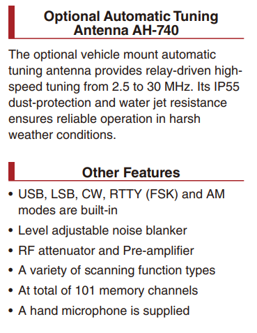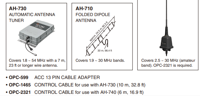 El sintonizador de antena automático opcional AH-730 realiza operaciones de sintonización a una alta velocidad de aproximadamente 2 a 3 segundos. Cuando cambia la banda de operación, la información de la banda se transfiere al sintonizador y se ajusta automáticamente a la antena.