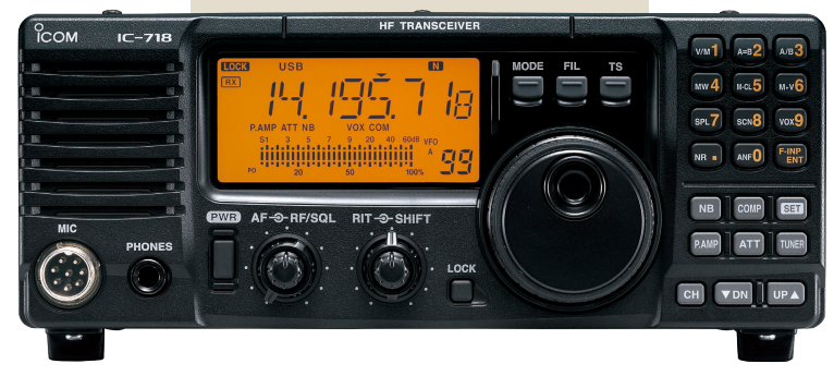El IC-718 es un equipo compacto con amplias funciones para comunicaciones HF. Las bandas HF le permiten comunicarse a largas distancias, llegando incluso al otro lado de la Tierra. Con su amplio rango dinámico, alta relación señal/ruido y funcionamiento a pleno rendimiento, podrá establecer contactos fácilmente. Experimente la combinación de tecnología digital y RF y se dará cuenta de que el IC-718 es el equipo más práctico para sus necesidades.