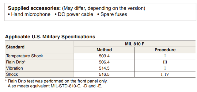 | Consumo de energía | Rx | 1,3 A (en espera), 2,0 A (audio máximo) |