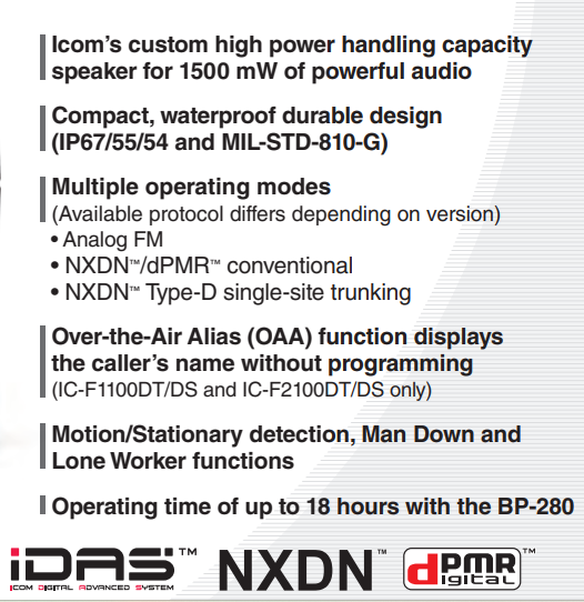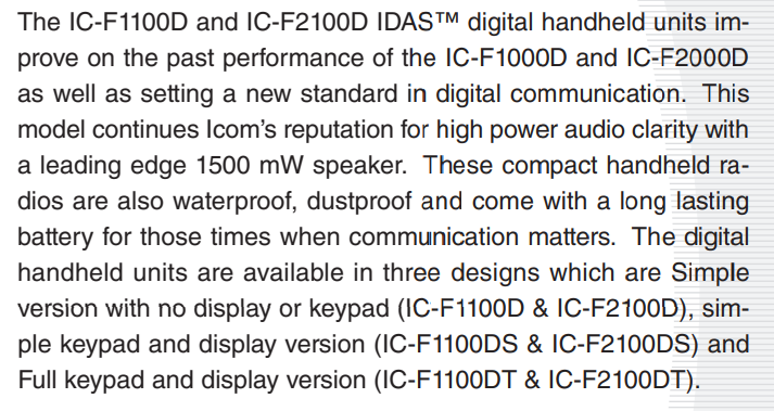 La serie F1100D/F2100D es una elegante radio portátil que cabe perfectamente en la mano y está diseñada para ser la radio digital básica y de nivel medio. Tres opciones de modelo, básico - sin pantalla, sencillo incluye una serie de características como el funcionamiento en modo digital IDAS en IDAS convencional y convencional multisitio, funciones de emergencia inteligentes, y un chasis robusto, resistente al agua y al polvo. Un altavoz con capacidad de manejo de alta potencia y mejoras acústicas proporcionan un audio alto y claro líder en su clase (1500 mW). Esta radio es ideal para satisfacer las necesidades de una amplia gama de empresas, incluidas las de educación, hostelería y comercio minorista.