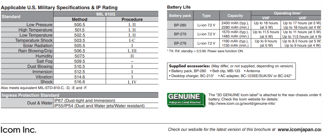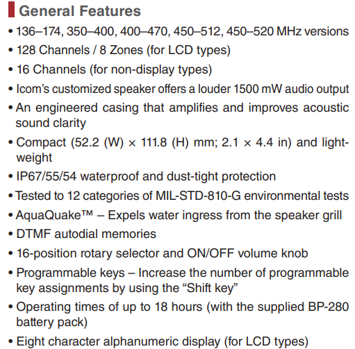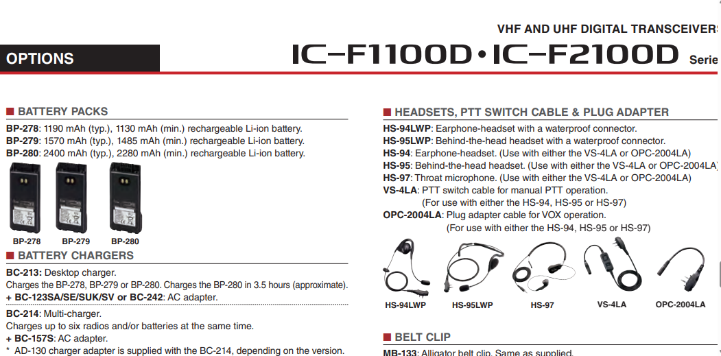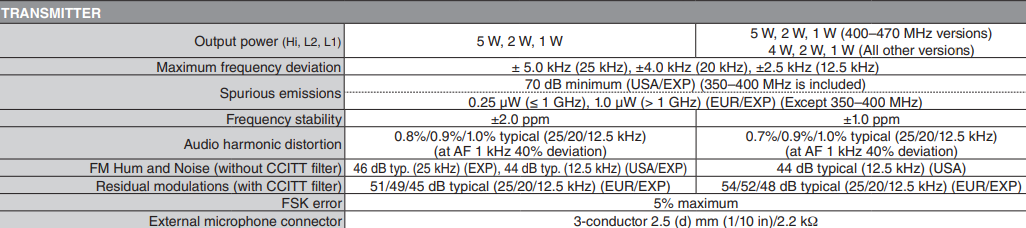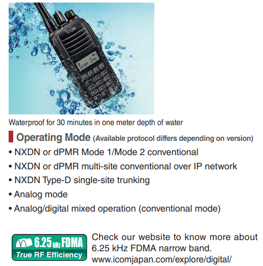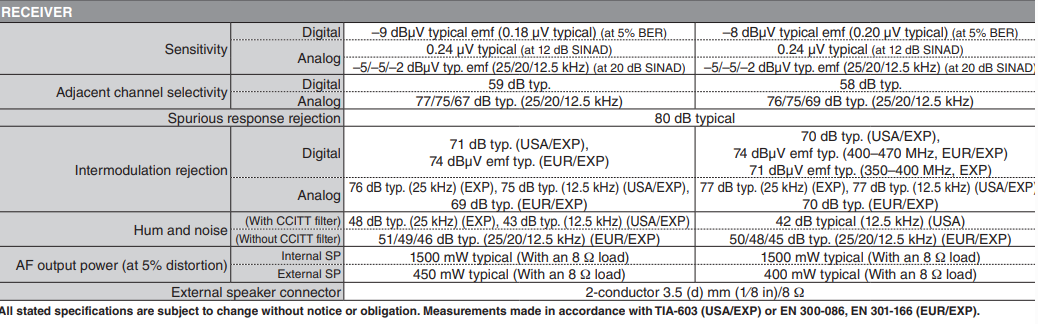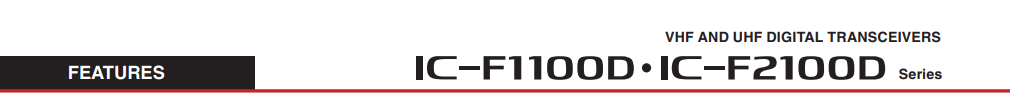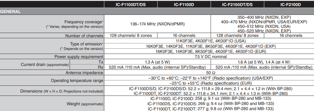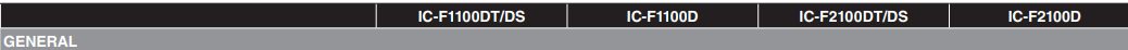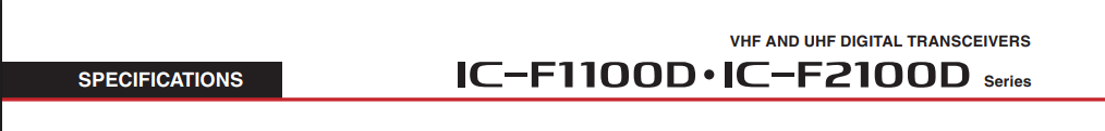 All stated specifications are subject to change without notice or obligation. Measurements made in accordance with TIA-603 (USA/EXP) or EN 300-086, EN 301-166 (EUR). The IC-F1100DT/DS/D VHF versions are under evaluation as of May 2018.