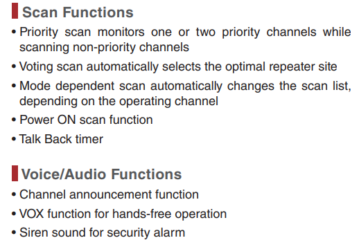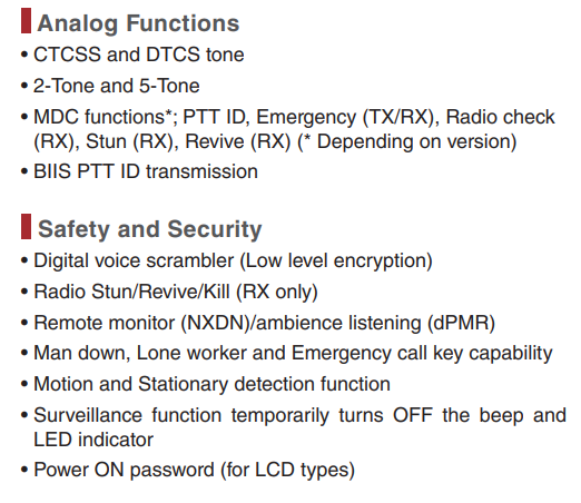 - Funciones MDC*; PTT ID, Emergencia (TX/RX), Comprobación de radio (RX), Aturdir (RX), Reanimar (RX)