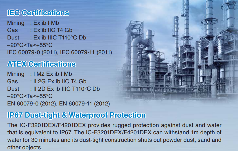 Se trata de la directiva de la Unión Europea que deben cumplir todas las radios bidireccionales que se utilicen en entornos potencialmente explosivos. ATEX e IEC tienen normas técnicamente idénticas para equipos eléctricos desde 2006. La serie F3201DEX proporcionará una de las mayores protecciones ATEX contra gas, polvo y minería.