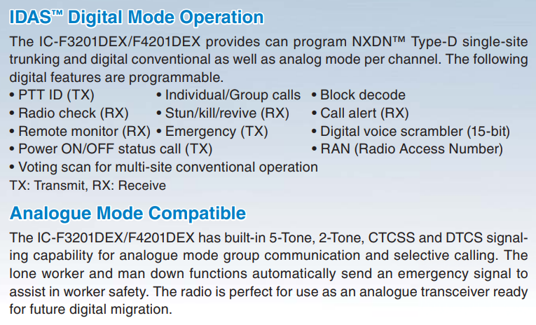 La serie F3201DEX incorpora una serie de funciones de seguridad en modo analógico. La función de trabajador solitario detecta cuando la radio no se utiliza durante un periodo preestablecido y suena un pitido que requiere que el usuario pulse un botón. Si no se pulsa ningún botón en el tiempo preestablecido, se transmite automáticamente una señal de emergencia y se alerta a los compañeros de trabajo o al operador. La función de hombre caído envía una señal de emergencia si se deja en posición horizontal.