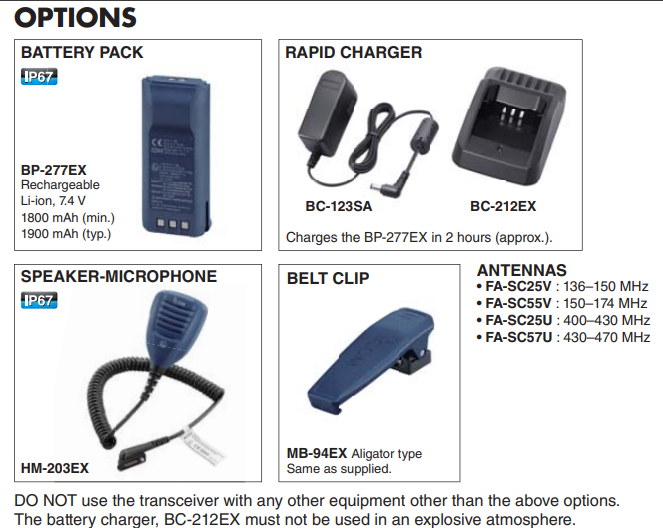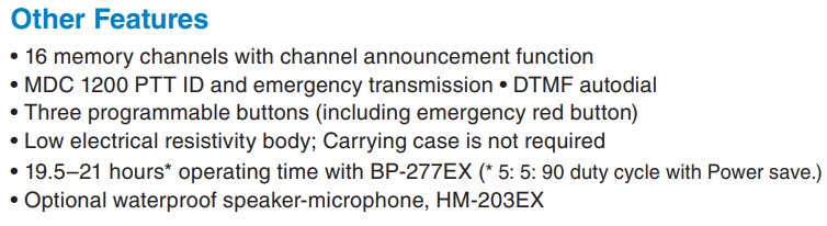 Peso 258 g; 9,1 oz (sólo radio) 466g; 1.03 lb (Con MB-94EX, BP-277EX & FA-SC55V)