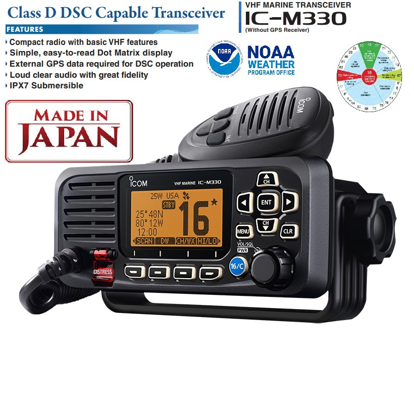 ICOM IC-M330 (Sin receptor GPS) 25W Radio Móvil Marina de montaje fijo VHF ultra compacto de máximo rendimiento, teclas programables, IPX7, DSC de clase D, AQUAQUAKE, NOAA Precio +iva