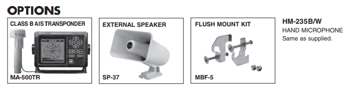 - Micrófono de mano suministrado, HM-235B/W, con teclas para subir/bajar canales y una tecla para canal de llamada/CH16