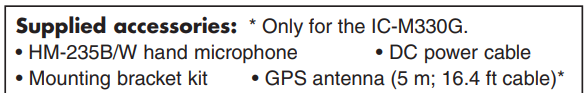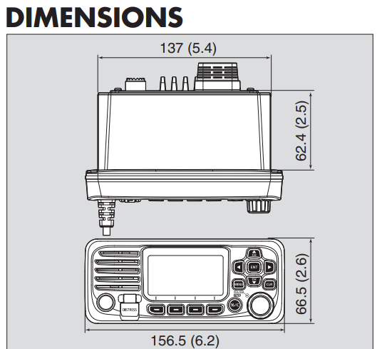 El IC-M330/G tiene un cuerpo compacto que cabe en la palma de la mano (An. × Al. × Pr.; 156,5 × 66,5 × 88,2 mm; 6,2 × 2,6 × 3,5 pulgadas). La radio se puede instalar en espacios limitados.