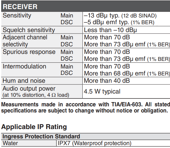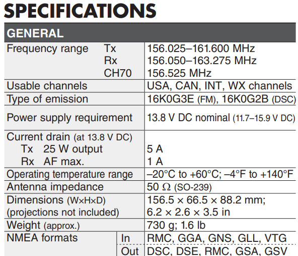 Rango de frecuencia | Tx | 156,025–161,600 MHz |
