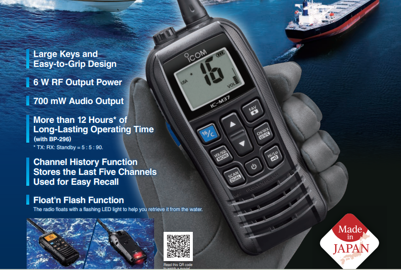 El IC-M37 tiene un cuerpo de diseño delgado y botones grandes, lo que permite un manejo sencillo incluso con guantes mientras se pesca o navega. Esto permite responder rápidamente a las llamadas. Además, el IC-M37 proporciona acceso instantáneo al canal 16, así como al canal de llamadas.