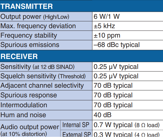 Weight (approximate) | 293 g, 10.3 oz (with BP-296, antenna and belt clip) |