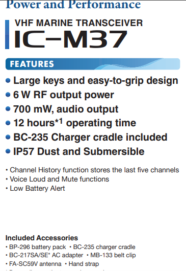 Los 6 vatios de potencia de transmisión del IC-M37 proporcionan un rango de comunicación extendido para el usuario.
