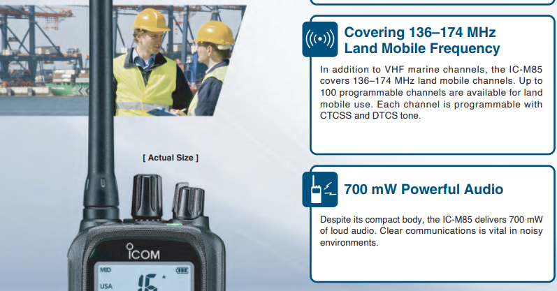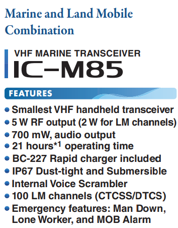 Además de los canales marinos VHF, el IC-M85 cubre canales móviles terrestres de 136 a 174 MHz. Hay disponibles hasta 100 canales programables para uso móvil terrestre. Cada canal es programable con tonos CTCSS y DTCS.