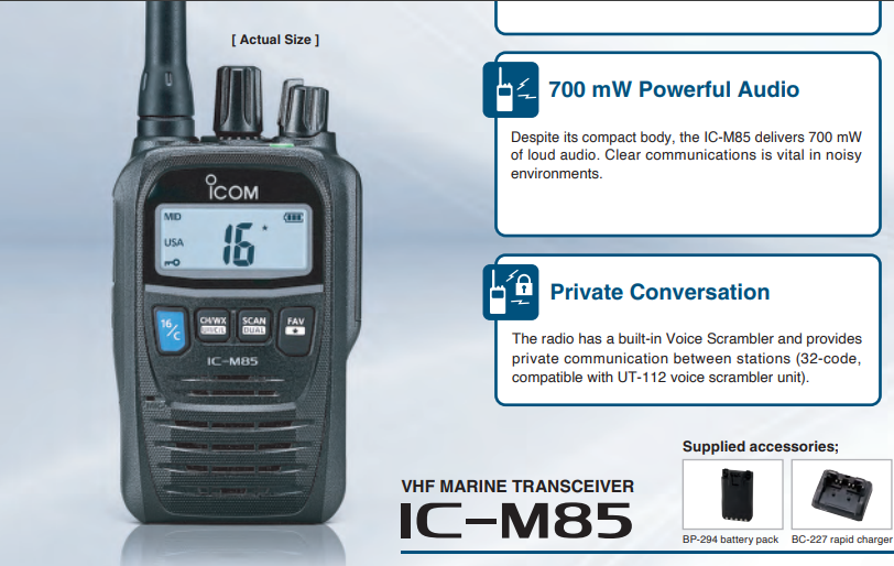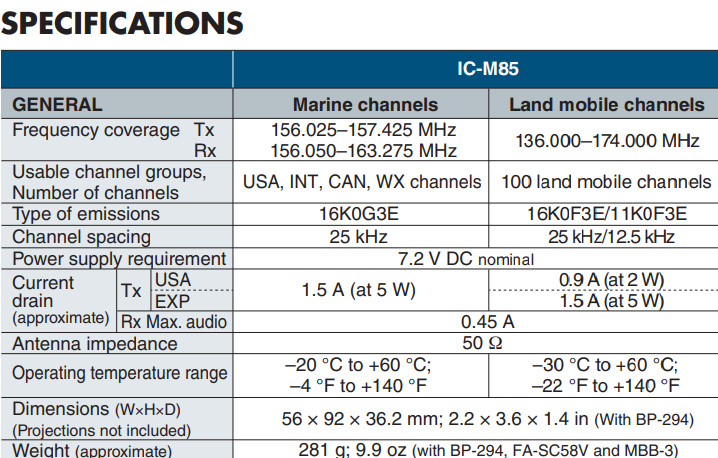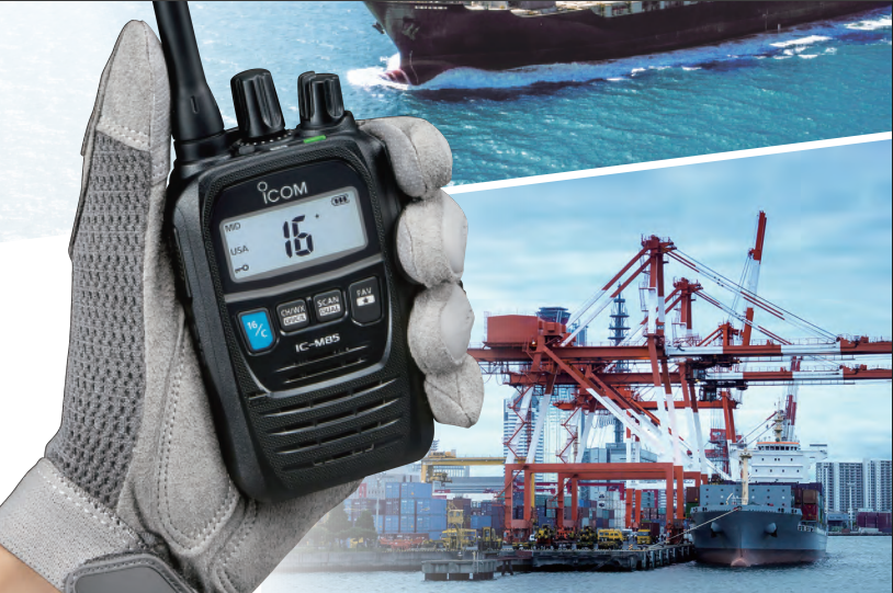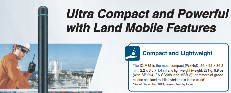 El IC-M85 es la radio híbrida móvil terrestre y marina de grado comercial más compacta (An. × Al. × Pr.: 56 × 92 × 36,2 mm; 2,2 × 3,6 × 1,4 pulgadas) y liviana (peso: 281 g; 9,9 oz (con BP-294, FA-SC58V y MBB-3)) del mundo*.