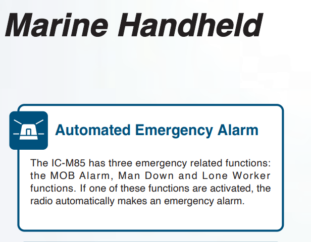 El IC-M85 tiene tres funciones relacionadas con emergencias: alarma MOB, funciones de hombre caído y trabajador solitario. Si se activa una de estas funciones, la radio emite automáticamente una alarma de emergencia.