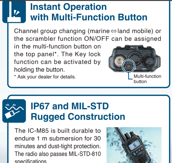 El IC-M85 está fabricado para soportar una inmersión de 1 m durante 30 minutos y es resistente al polvo. La radio también cumple con las especificaciones MIL-STD-810.