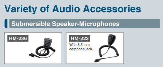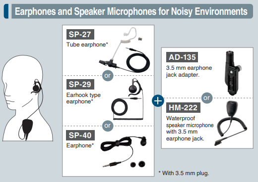 SP-40 Earphone* + AD-135 3.5 mm earphone jack adapter + HM-222 Waterproof speaker microphone with 3.5 mm earphone jack