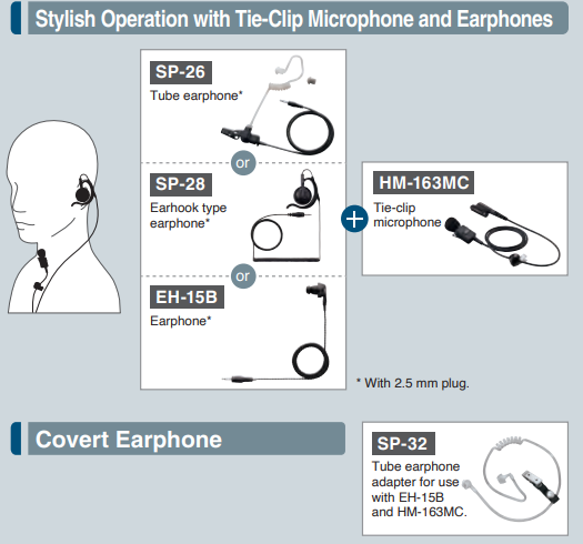 EH-15B Earphone* + HM-163MC Tie-clip microphone