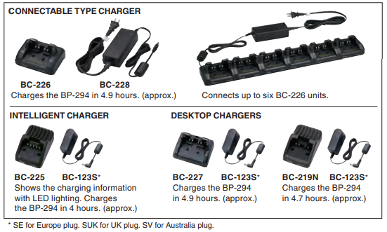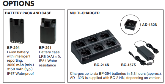 Charges up to six BP-294 batteries in 5.3 hours (approx.). AD-132N is supplied with BC-214N, depending on version.